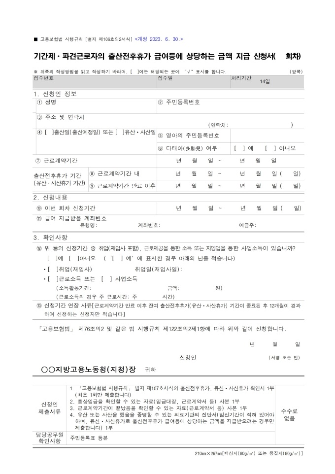 9,000원/월기간제ㆍ파견근로자의 출산전후휴가 급여등에 상당하는 금액 지급 신청서 서식입니다. 「고용보험법」 제76조의2 및 같은 법 시행규칙 제122조의2제1항에 따라 기간제, 파견근로자의 출산전후휴가 급여등에 상당하는 금액 지급 신청시 사용할 수 있는 서식입니다. 고용보험법 시행규칙 [별지 제106호의2서식]