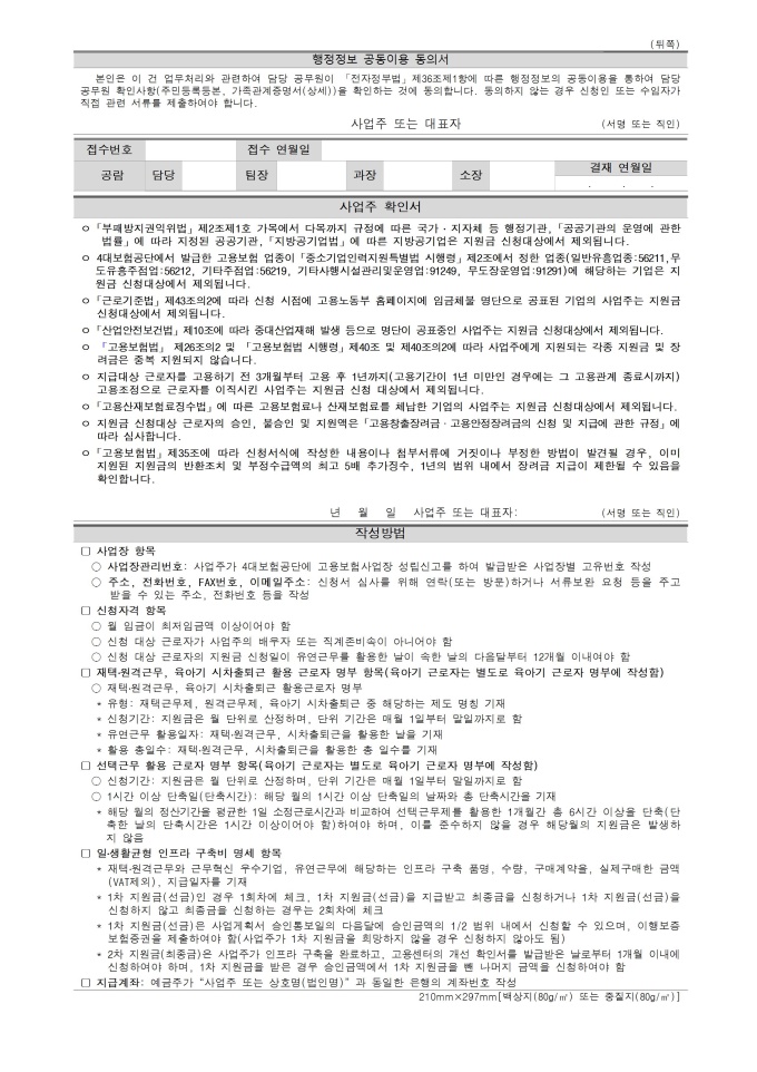 9,000원/월일가정양립 환경개선 지원금 지급 신청서(고용창출장려금·고용안정장려금의 신청 및 지급에 관한 규정) [별지 24] 서식입니다. 소속 근로자가 일․생활균형을 위해 유연근무를 활용하거나 재택․원격․근무혁신․유연근무 등을 위해 인프라를 구축하는 경우에 사업주를 지원하는 제도로 「고용보험법」제25조 및 같은 법 시행령 제35조,「고용창출장려금·고용안정장려금의 신청 및 지급에 관한 규정」제19조에 따라 고용안정장려금 지급 심사를 신청할 때 사용할 수 있는 서식입니다.