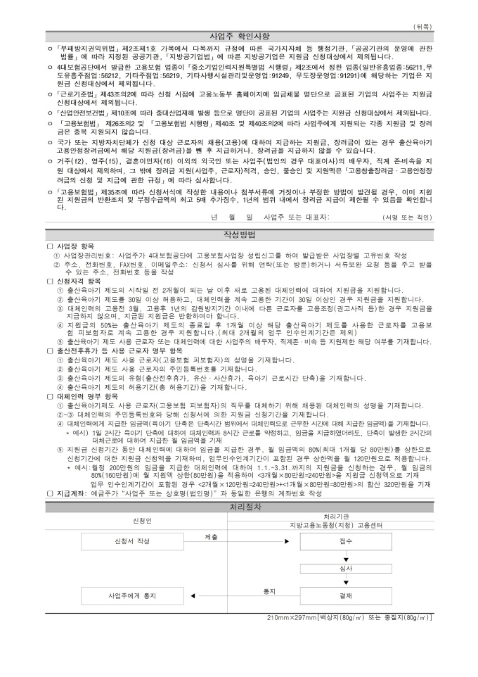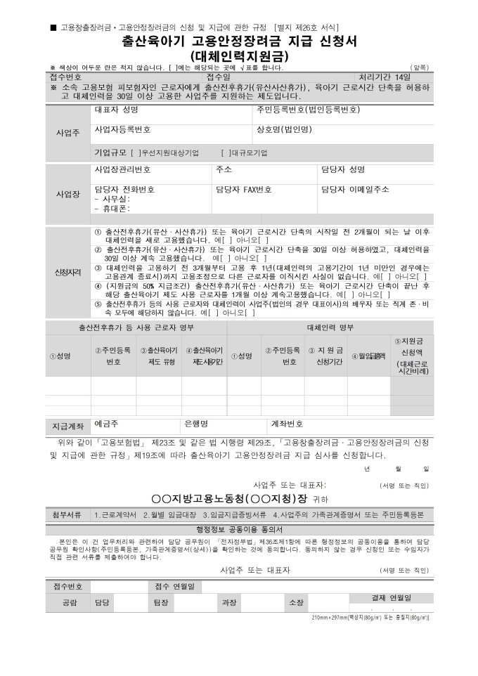 9,000원/월출산육아기 고용안정장려금 지급 신청서(대체인력지원금) 서식입니다. 소속 고용보험 피보험자인 근로자에게 출산전후휴가(유산사산휴가), 육아기 근로시간 단축을 허용하고 대체인력을 30일 이상 고용한 사업주를 지원하는 제도로 「고용보험법」 제23조 및 같은 법 시행령 제29조,「고용창출장려금·고용안정장려금의 신청 및 지급에 관한 규정」제19조에 따라 출산육아기 고용안정장려금 지급 심사를 신청할 때 사용할 수 있는 서식입니다.