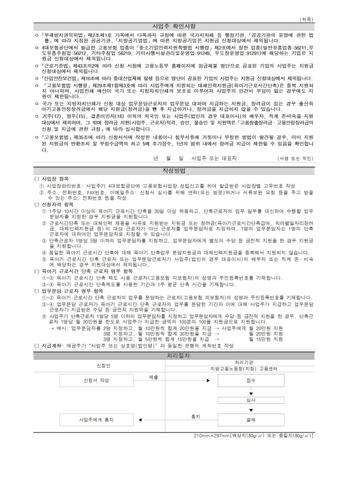 9,000원/월출산육아기 고용안정장려금 지급 신청서(육아기 단축업무 분담지원금) 서식입니다. 육아기 근로시간 단축 근로자의 업무를 분담한 동료 근로자에게 금전적 지원을 한 우선지원대상기업 사업주를 지원하는 제도로 「고용보험법」 제23조 및 같은 법 시행령 제29조,「고용창출장려금·고용안정장려금의 신청 및 지급에 관한 규정」제19조에 따라 출산육아기 고용안정장려금 지급 심사를 신청할 때 사용할 수 있는 서식입니다.