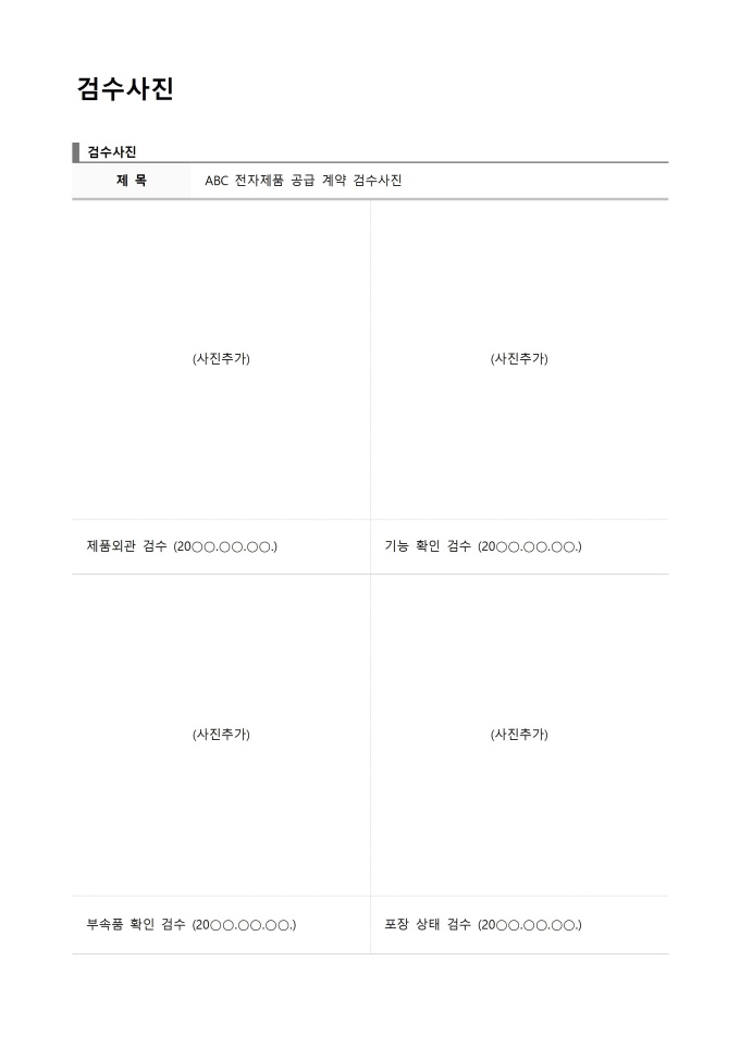 9,000원/월검수조서(검수사진 포함) 서식입니다. 검수조서(검수사진 포함) 서식은 제품이나 서비스의 품질을 확인하고 검토하기 위해 작성되는 문서입니다. 이 서식은 검수 과정에서 수집된 정보를 체계적으로 기록하고, 검수된 품목의 상태를 명확히 보여주기 위해 사용됩니다. 주로 제조업체, 건설업, 물류 등 다양한 산업에서 활용됩니다.