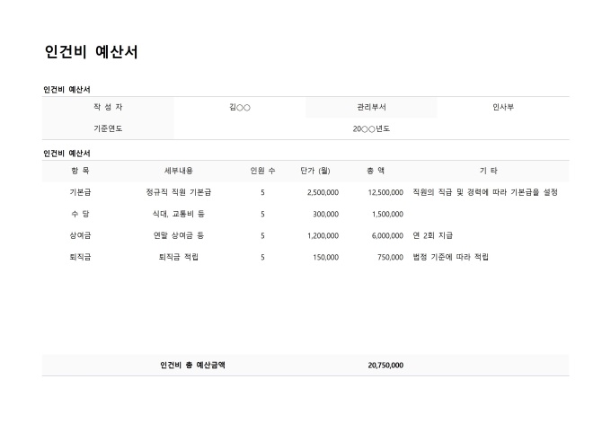 9,000원/월인건비 예산서 (간단양식) 서식입니다. 인건비 예산서는 기업이나 기관에서 인력 관련 비용을 계획하고 관리하기 위한 문서입니다. 이는 인건비가 조직 운영에서 중요한 부분을 차지하기 때문에, 정확한 예산 수립이 필요합니다.