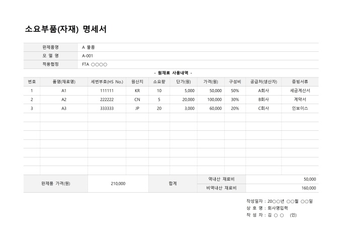 9,000원/월소요부품(자재) 명세서 서식입니다. 소요부품(자재)명세서는 완제품을 구성하는 원재료의 명세를 나타낸 것으로 완제품을 구성하는 원재료와 이의 소요량, 단가, 원산지 등을 표시한 명세서 양식입니다.