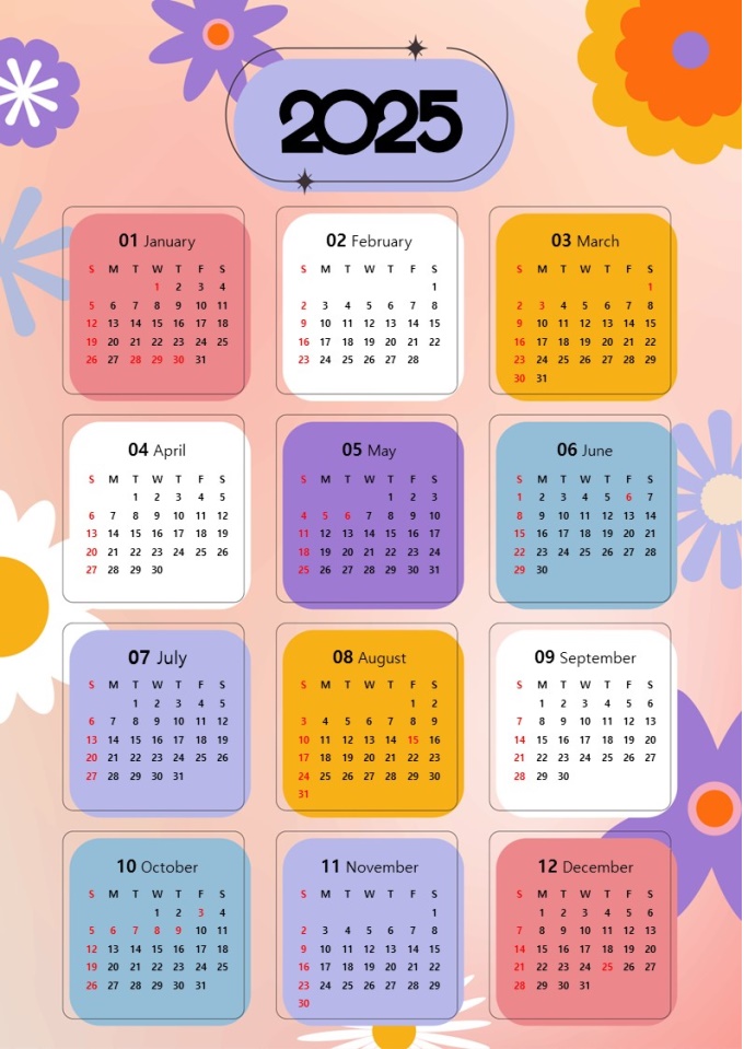 2025년 PPT 서식 달력(원페이지,세로형,PPT달력,알록달록)입니다. 일정을 관리하시는데 편리하도록 제작하였습니다.