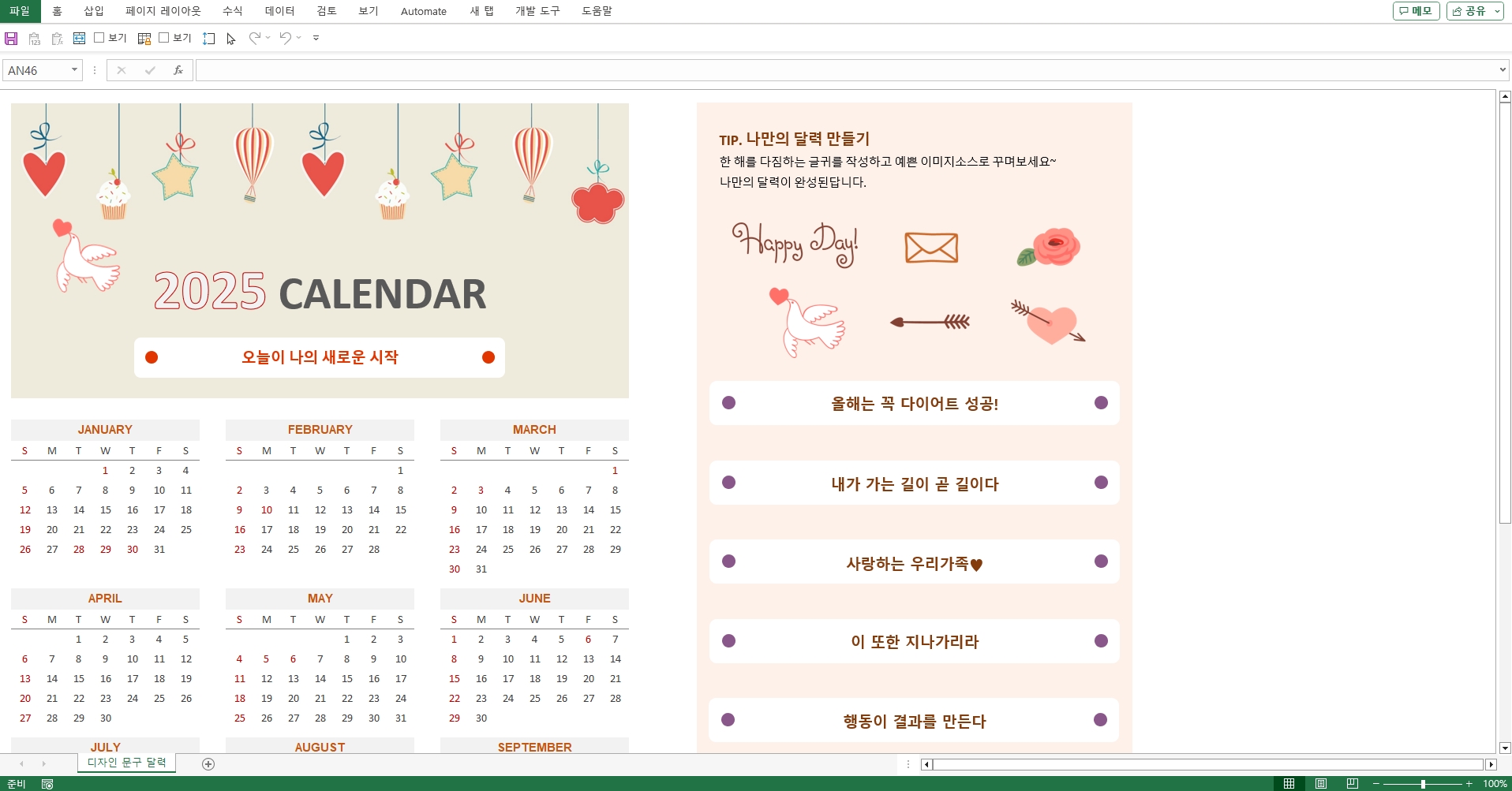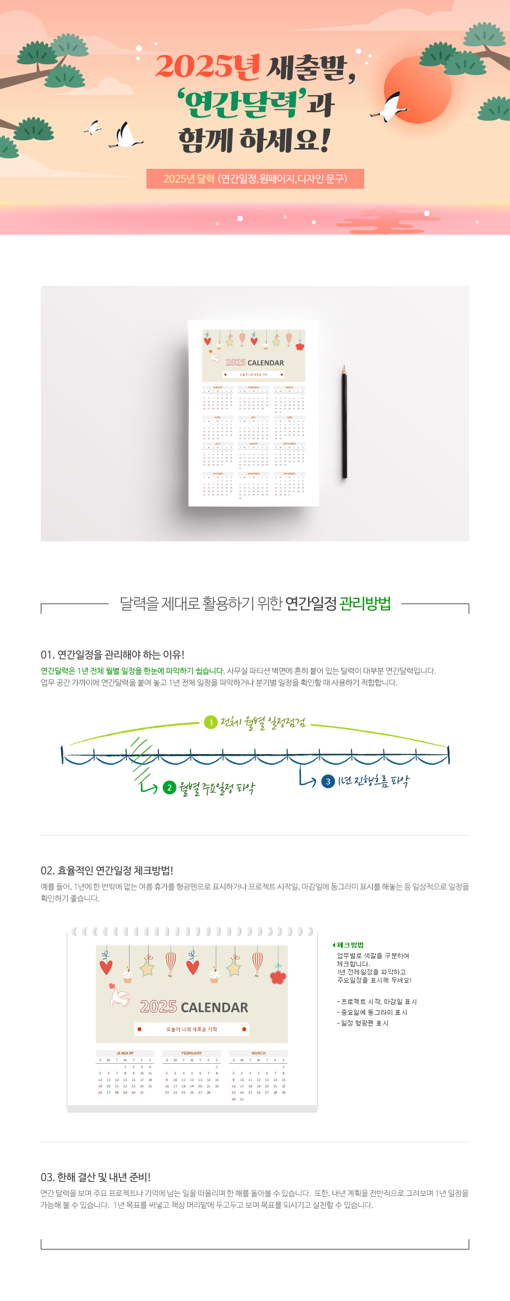 2025년 달력(연간일정,원페이지,디자인 문구) 입니다. 원페이지로 제작되었으며 귀여운 폰트와 디자인으로 나만의 달력을 만들 수 있습니다.