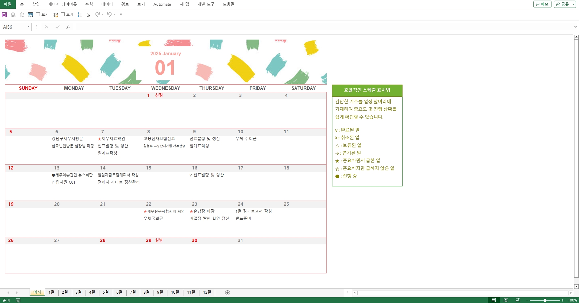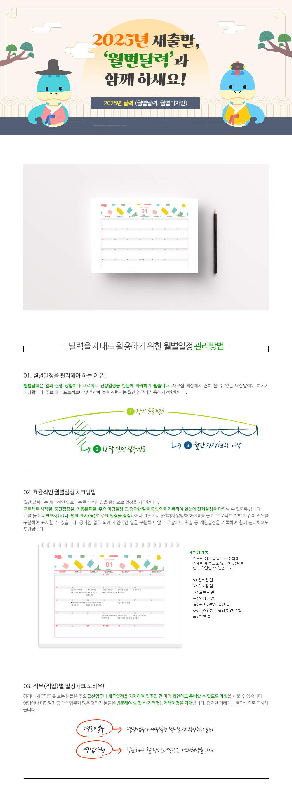 2025년 달력(월별일정,월별디자인) 입니다. 월별로 다양한 디자인을 활용하여 제작하였습니다.