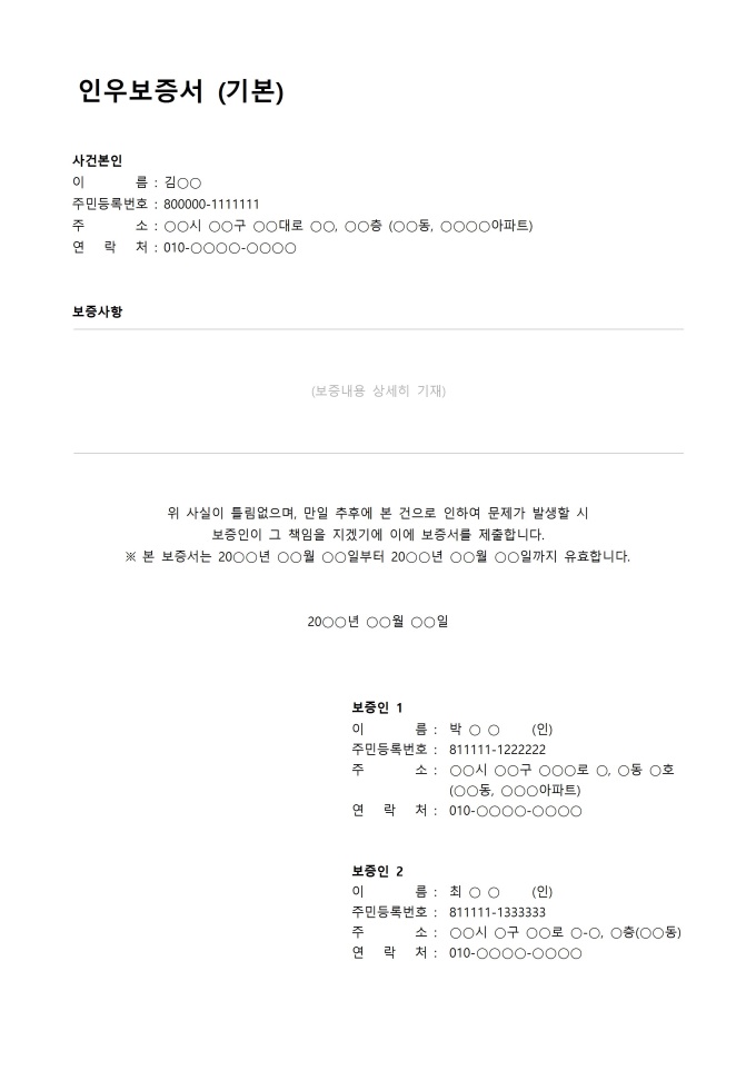 9,000원/월인우보증서 (기본) 서식입니다. 인우보증서는 특정 거래나 계약이 이행될 것임을 보증하는 문서입니다. 주로 금융 거래, 부동산 계약, 서비스 제공 등 다양한 분야에서 사용됩니다. 이 보증서는 보증인이 계약의 조건을 준수하지 않을 경우, 보증인이 대신 책임을 지겠다는 내용을 포함하고 있습니다.