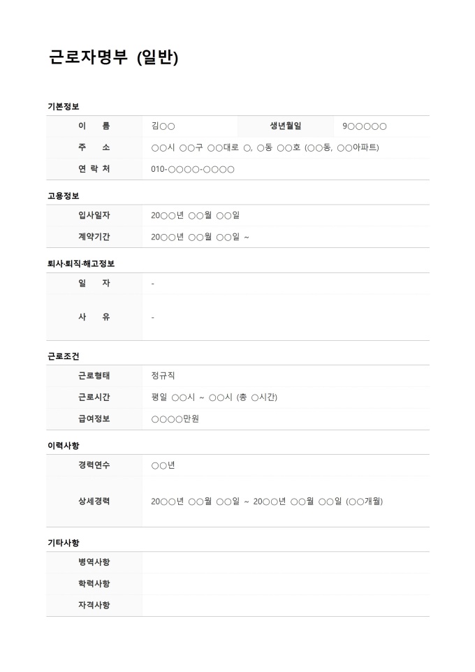 9,000원/월근로자명부(일반) 서식은 조직 내 근로자에 대한 체계적인 정보를 제공하여 인사 관리의 효율성을 높이고, 근로자의 권리를 보호하는 데 필수적인 도구입니다. 이를 통해 조직은 법적 요구 사항을 준수하고, 근로자와의 원활한 소통을 유지할 수 있습니다. 또한, 근로자명부를 정기적으로 업데이트하고 관리하는 것은 인사 관리의 기본적인 부분으로, 조직의 성장과 발전에 기여하는 중요한 요소입니다.