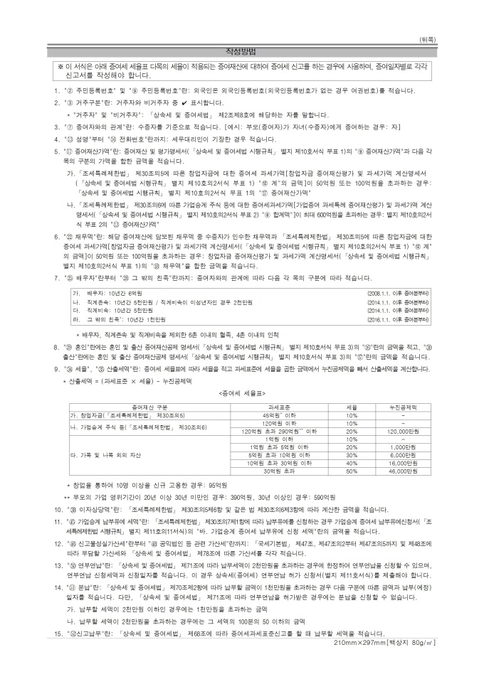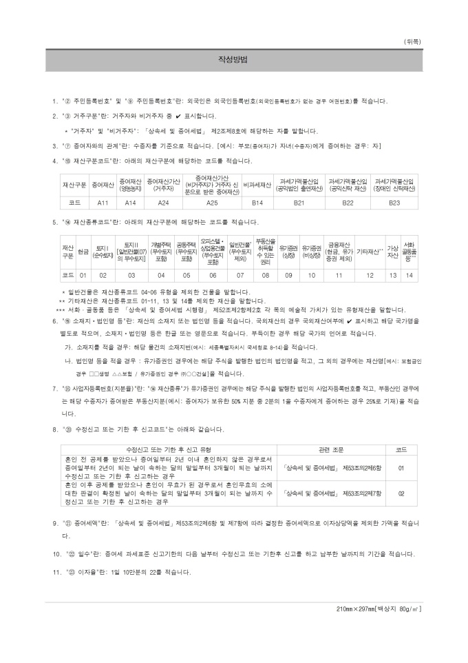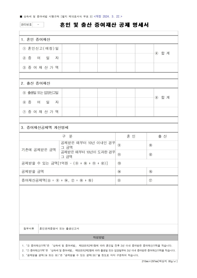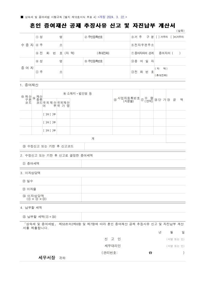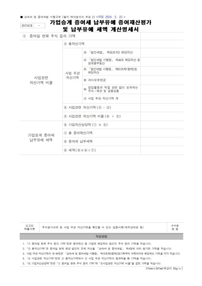 9,000원/월증여세과세표준신고 및 자진납부계산서(기본세율 적용 증여재산 신고용)¸ 증여재산 및 평가명세서¸ 가업승계 증여세 납부유예 증여재산평가 및 납부유예 세액 계산명세서¸ 혼인 및 출산 증여재산 공제 명세서¸ 혼인 증여재산 공제 추징사유 신고 및 자진납부 계산서(상속세 및 증여세법 시행규칙) 서식입니다. [별지 제10호서식]
