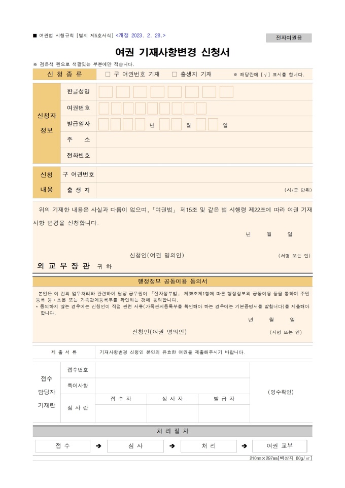9,000원/월여권 기재사항변경 신청서(여권법 시행규칙) 서식입니다. 여권법 제15조 및 같은 법 시행령 제22조에 따라 여권 기재사항 변경을 신청하고자 할 때 사용할 수 있는 서식입니다. [별지 제5호서식]