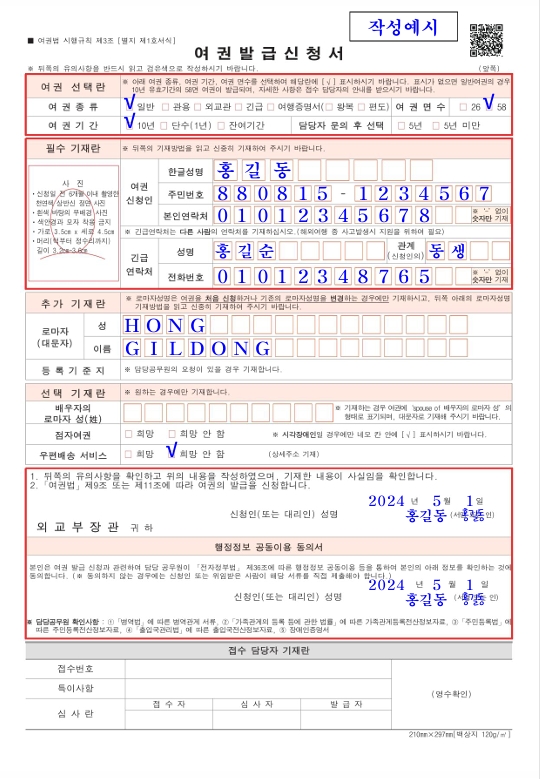 여권발급신청서 (여권법 시행규칙) 작성예시 서식입니다. 여권발급신청서를 작성할 때 작성 예시를 참고하여 작성하면 원활한 발급 절차를 진행할 수 있습니다. 여권법 시행규칙 제3조 [별지 제1호서식] 작성예시