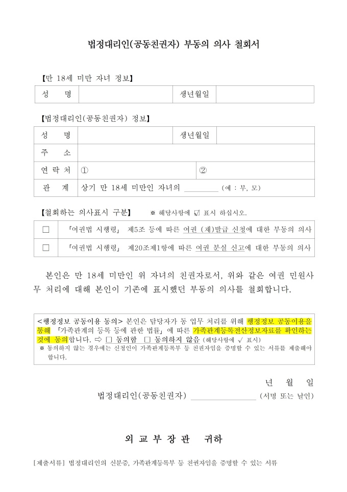 9,000원/월법정대리인(공동친권자) 부동의 의사 철회서 (여권법 시행령 관련) 서식입니다. 만 18세 미만의 자녀 친권자가 기존의 여권 민원 사무 처리에 대한 부동의 의사를 철회하고자 할 때 사용할 수 있는 서식입니다.