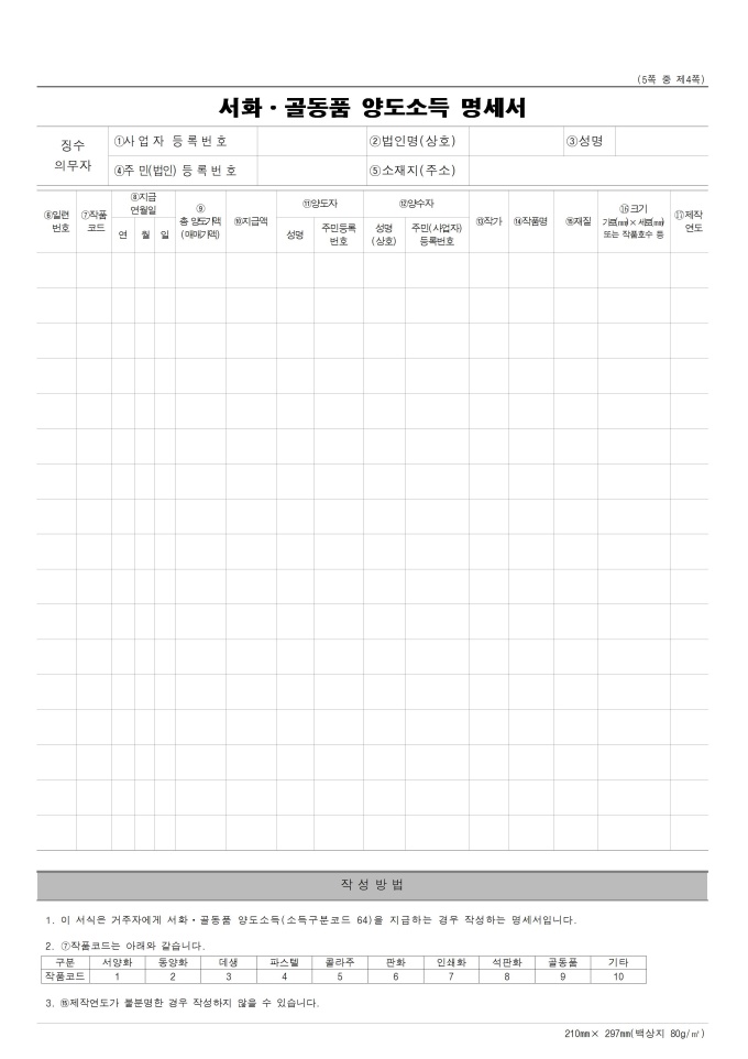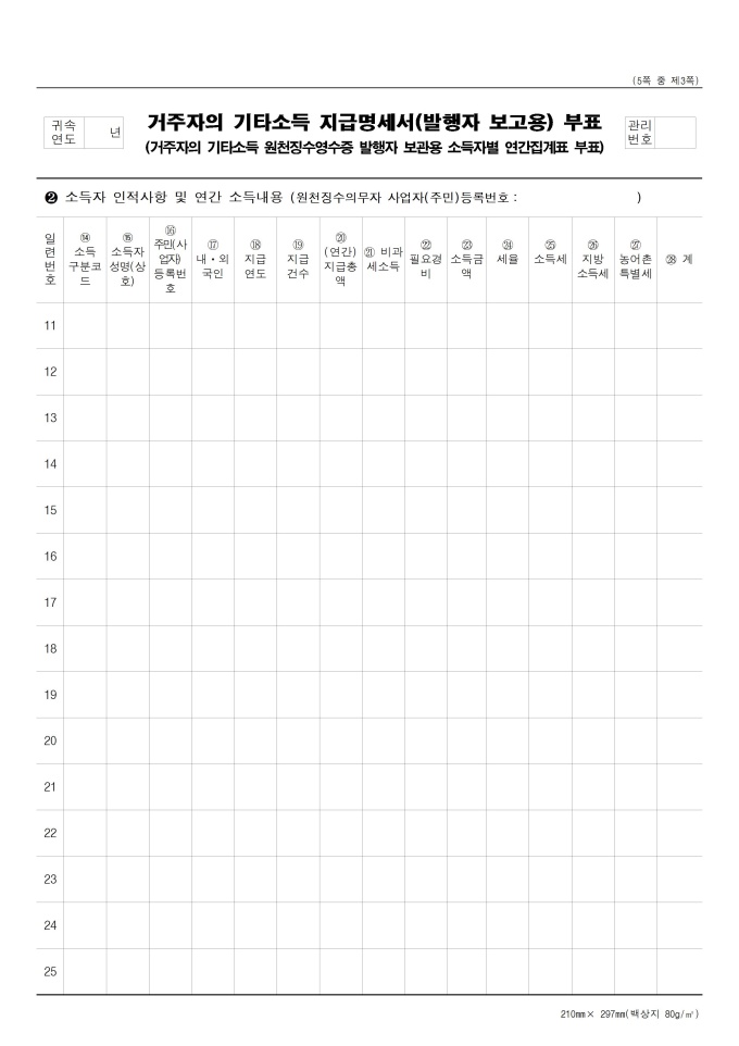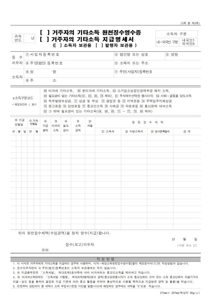 9,000원/월거주자의 기타소득 지급명세서(발행자 보고용)서식입니다. 소득세법 시행규칙 [별지 제23호서식(4)]