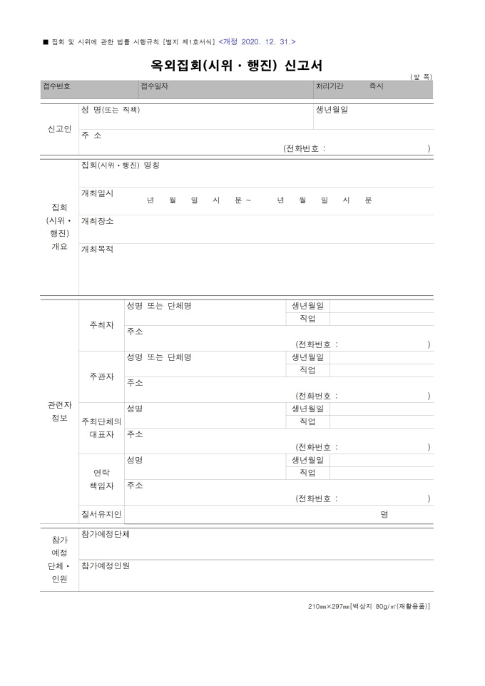 9,000원/월옥외집회(시위ㆍ행진) 신고서 서식입니다. 「집회 및 시위에 관한 법률」 제6조제1항 및 같은 법 시행규칙 제2조제1항에 따라 옥외집회 신고시 사용할 수 있는 서식입니다. 집회 및 시위에 관한 법률 시행규칙[별지 제1호서식] <2020. 12. 31 개정>