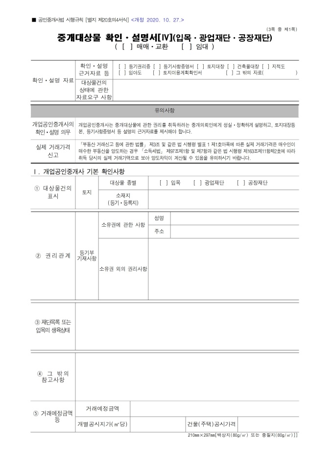 9,000원/월중개대상물 확인ㆍ설명서[Ⅳ](입목ㆍ광업재단ㆍ공장재단)(매매ㆍ교환, 임대) 서식입니다. 공인중개사법 시행규칙 [별지 제20호의4서식] <개정 2020. 10. 27>