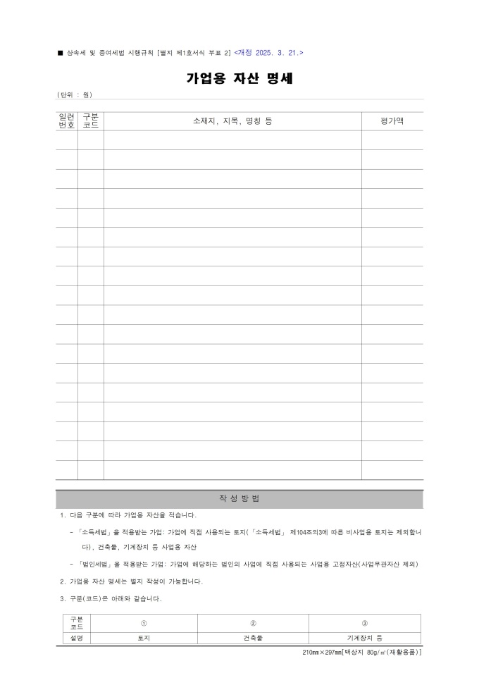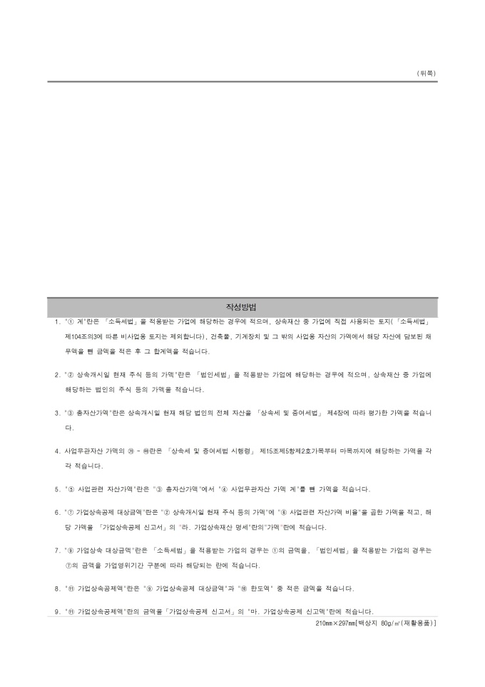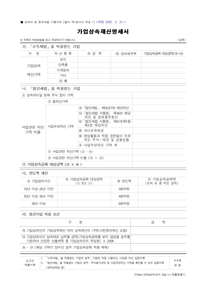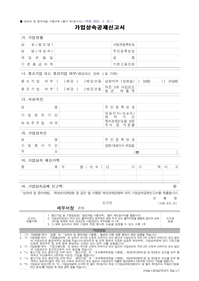 9,000원/월가업상속공제신고서, 가업상속재산명세서, 가업용 자산 명세 서식입니다. 상속세 및 증여세법 제18조의2제3항 및 같은 법 시행령 제15조제22항에 따라 가업상속공제신고서를 제출하고자 할 때 사용할 수 있는 서식입니다. 시행규칙 [별지 제1호서식] ,