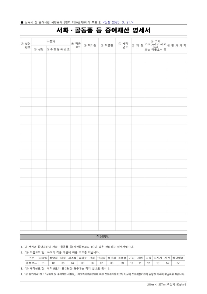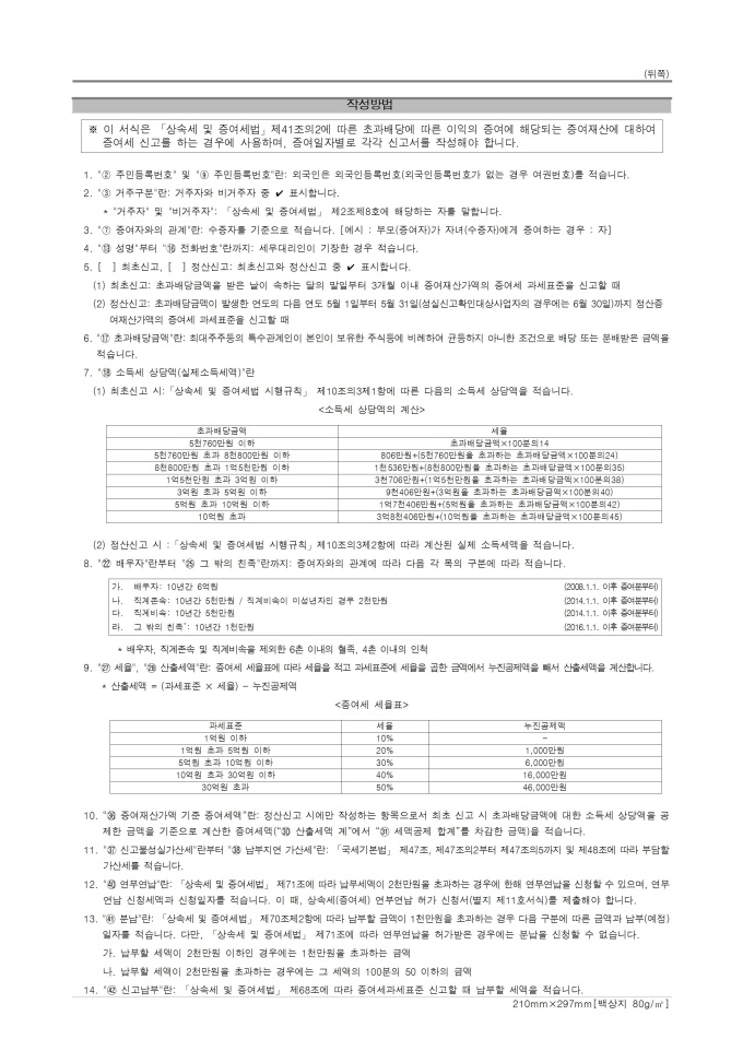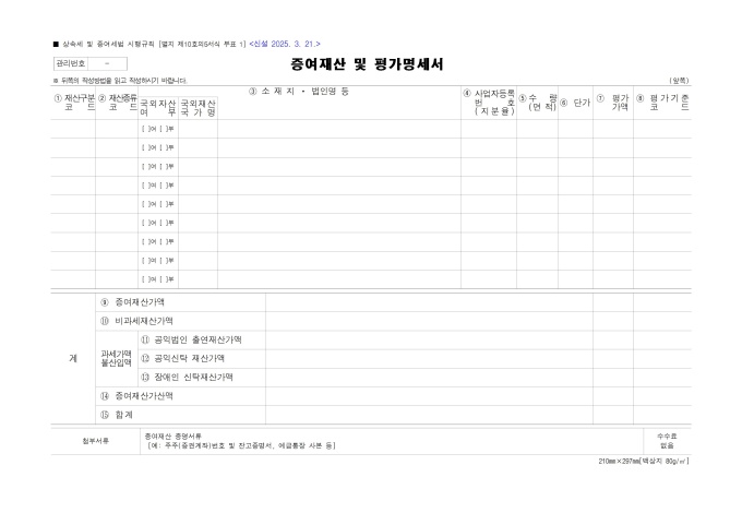9,000원/월증여세과세표준신고 및 자진납부계산서(초과배당에 따른 이익의 증여재산 신고용), 증여재산 및 평가명세서, 서화ㆍ골동품 등 증여재산 명세서 서식입니다. 상속세 및 증여세법 시행규칙 [별지 제10호의5서식]