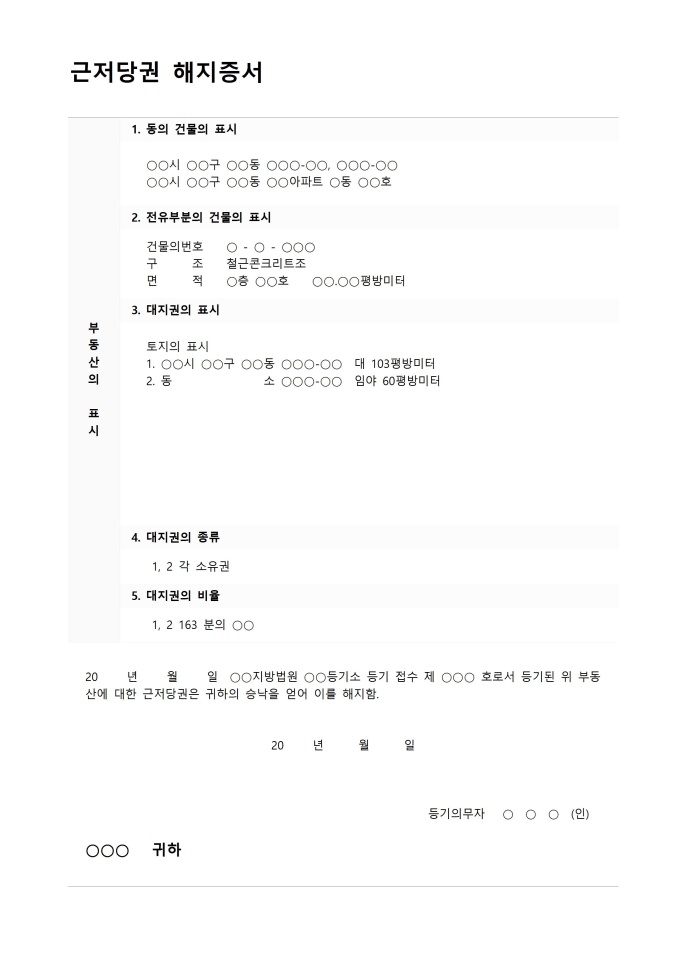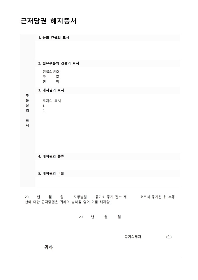 9,000원/월근저당권 해지증서 서식입니다. 근저당권을 해지한 것을 확인하기 위해 작성하는 서식으로 해당 권리가 소멸되었음을 증명하는 서식입니다.