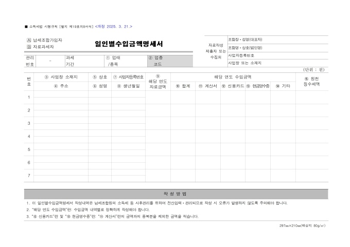 9,000원/월일인별수입금액명세서 서식입니다. 해당 서식은 납세조합원의 소득세 등 사후관리를 위하여 전산입력ㆍ관리되므로 작성 시 오류가 발생하지 않도록 주의해야 합니다. 소득세법 시행규칙 [별지 제19호의8서식]