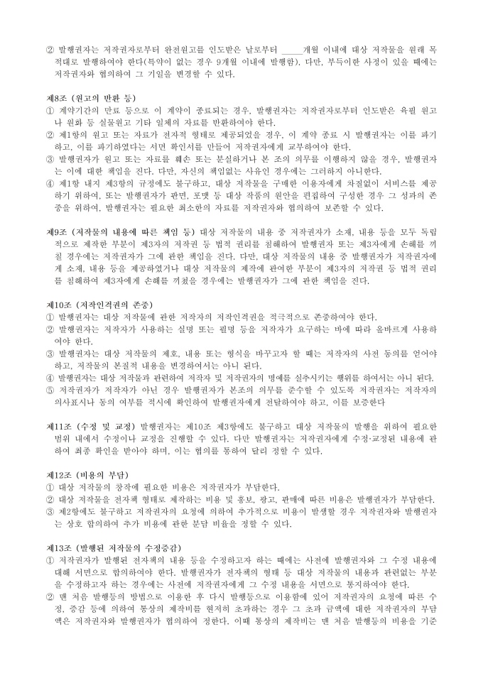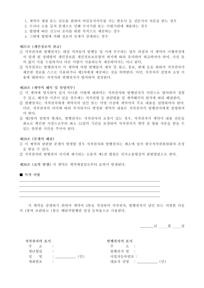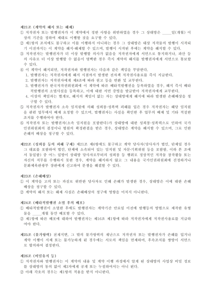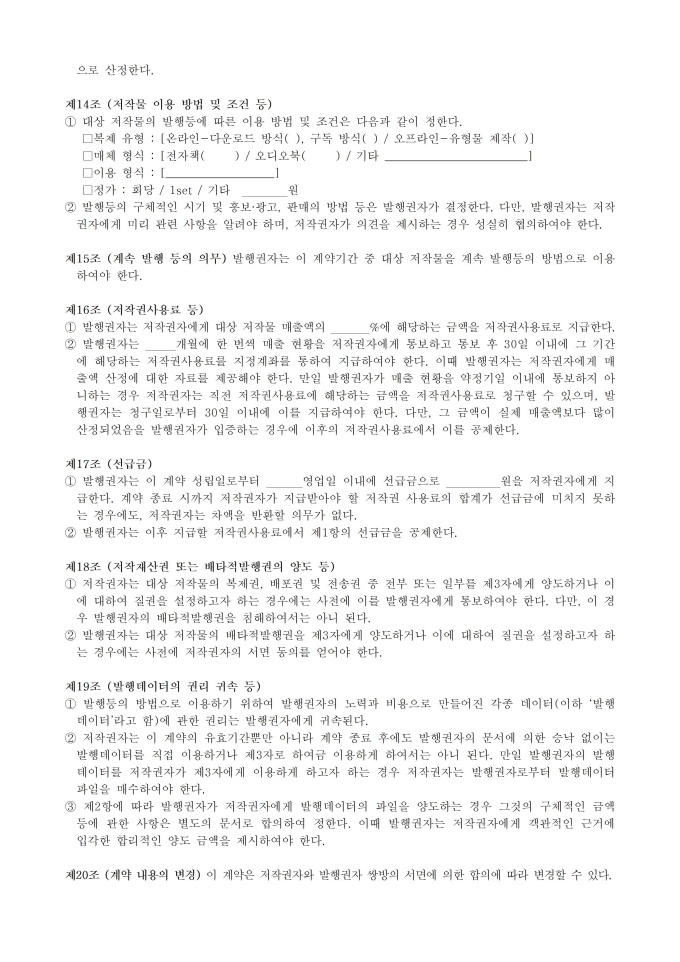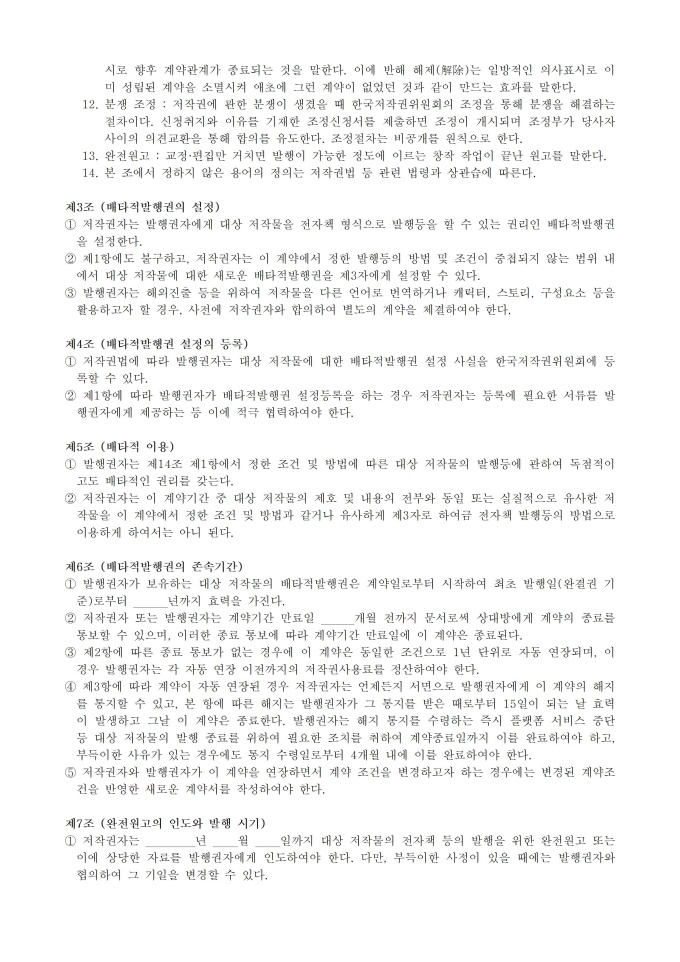 9,000원/월웹소설 분야 표준계약서_웹소설 전자출판 배타적발행권 설정계약서 서식입니다. 웹소설 분야 사업자 및 저작자 등 이해관계자가 공정한 계약을 체결하는 것을 지원하기 위해 작성된 표준 계약서 입니다.※ 출처 : 문화체육관광부 홈페이지 [자료공간]