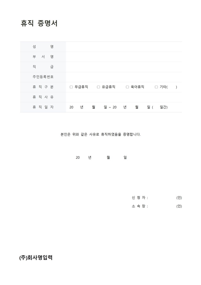 9,000원/월휴직 증명서 서식입니다. 휴직 증명서는 재직 중인 근로자가 개인적인 사유 등으로 일정 기간 업무를 중단하는 휴직 사실을 증명하는 문서로 인적사항, 휴직구분, 휴직사유, 휴직일자 등으로 구성됩니다.