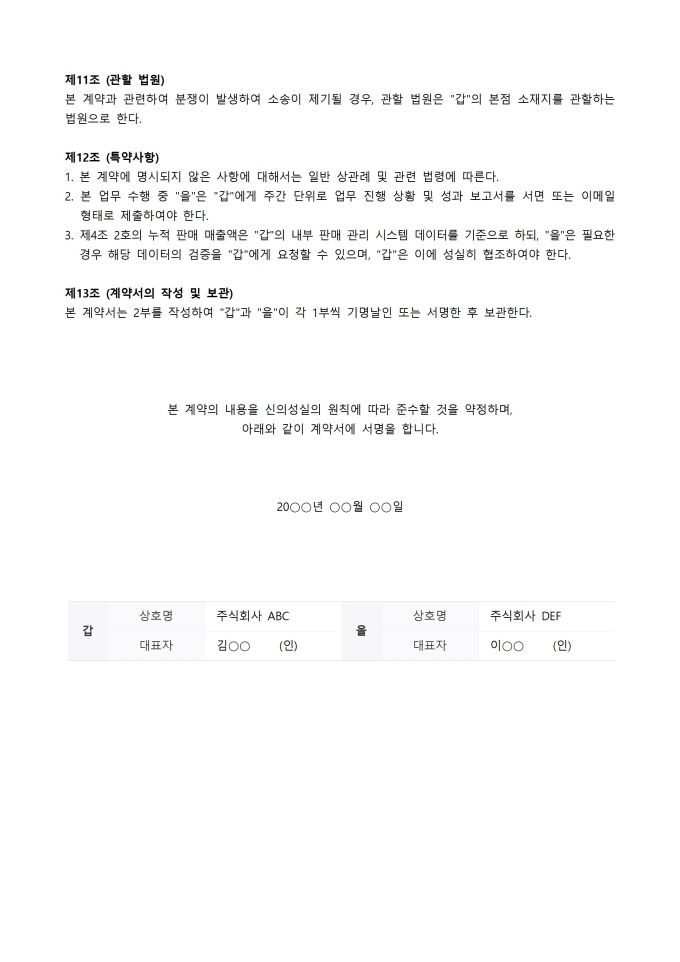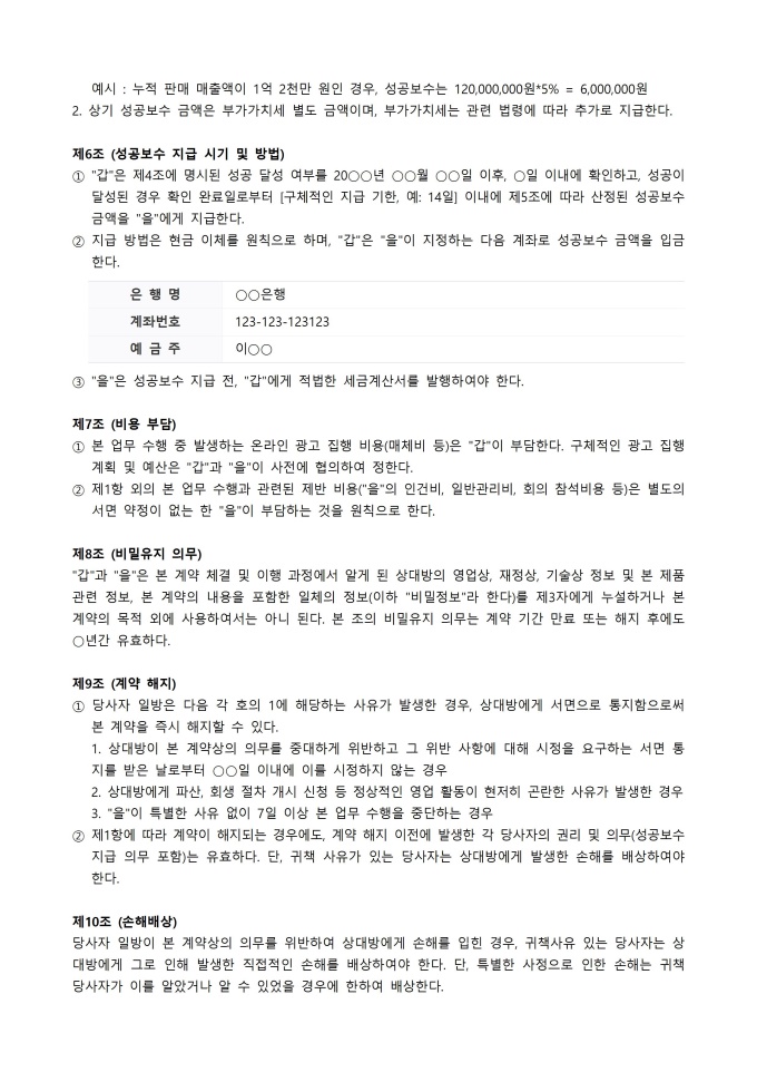 9,000원/월성공보수계약서 서식입니다. 성공보수계약서 서식은 특정 업무의 성공적인 완료를 조건으로 보수 지급을 약정하는 내용을 담고 있습니다. 성공의 기준, 지급될 보수 금액 및 지급 시기 등의 핵심 내용이 명확하게 기재되어야 하며, 해당 계약서는 법적 효력을 가지기 때문에 작성 시 전문가의 조언이 필수적입니다.