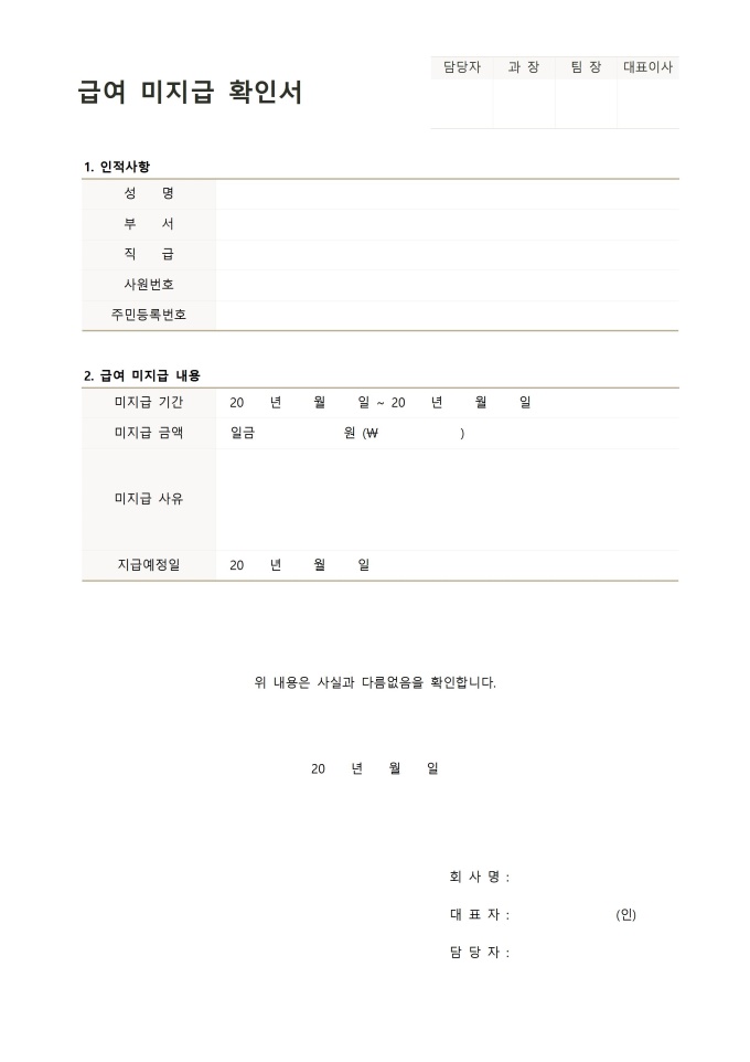 급여 미지급 확인서 서식입니다. 급여 미지급 확인서는 근로자가 회사로부터 약정된 급여나 기타 임금을 정해진 기일에 지급받지 못했음을 확인하는 문서로 근로자 인적사항, 임금이 미지급된 기간 및 금액, 그리고 미지급 사유 등이 구체적으로 기재되어야 합니다.
