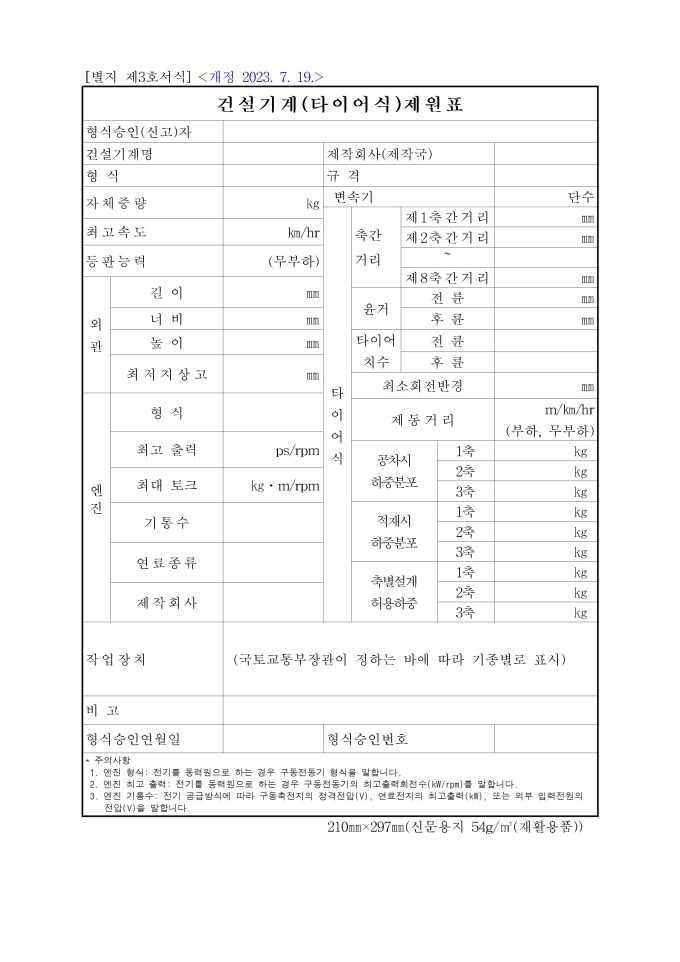 9,000원/월[별지 제3호서식] 건설기계(타이어식)제원표(건설기계관리법 시행규칙) 서식입니다. [개정 2023.7.19]
