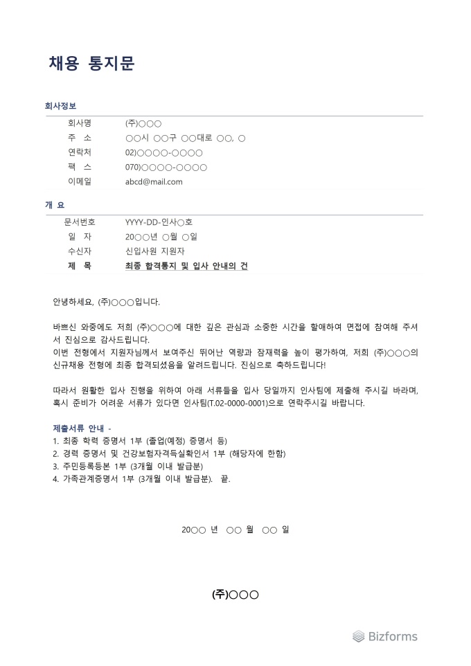 채용 통지문 서식입니다. 채용통지문은 지원자의 최종 합격을 공식적으로 통보하고, 입사 관련 필수 정보를 안내하는 문서입니다. 이는 고용 관계 시작을 위한 중요한 절차로, 채용 조건과 입사 시 필요한 서류 목록을 명확히 제시합니다. 해당 문서는 합격자에게 회사 합류를 환영하며, 안정적인 업무 시작을 지원하는 역할을 합니다.