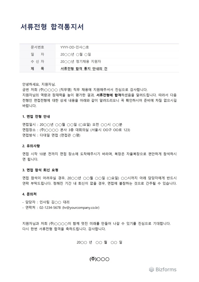 서류전형 합격통지서 서식입니다. 지원자의 서류 전형 합격 사실을 공식적으로 알리고, 다음 단계인 면접 전형에 대한 상세 정보를 제공하여 지원자가 채용 절차를 원활하게 진행할 수 있도록 돕는 문서입니다. 이는 기업의 전문성과 체계적인 채용 시스템을 보여주는 중요한 수단으로 활용됩니다.