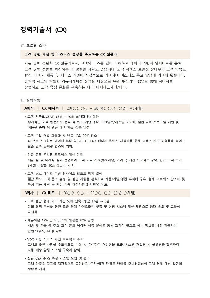 9,000원/월경력기술서 (CX, 고객경험관리자) 서식입니다. CX 경력기술서는 고객 경험 관리 분야의 전문가로서 쌓아온 경험과 역량, 주요 성과를 체계적으로 정리하는 문서로, 이는 지원자가 고객 접점에서의 문제 해결 능력, 서비스 개선 기여도, 그리고 고객 만족도 향상을 위한 전략 수립 및 실행 경험을 효과적으로 어필하는 데 중점을 둡니다.