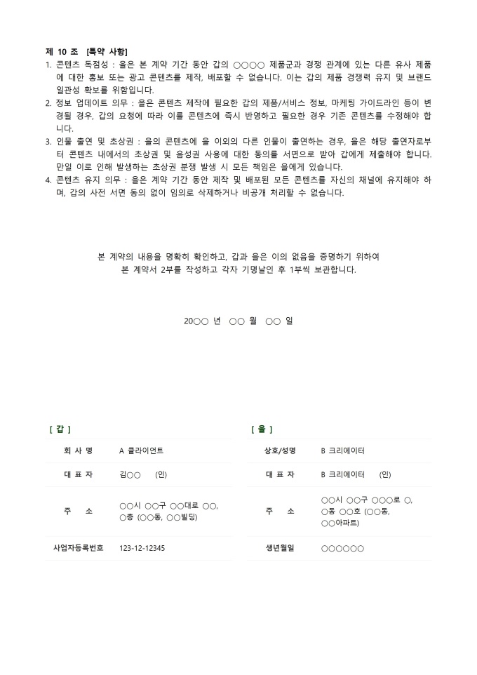9,000원/월계약서 (크리에이터) 서식입니다. 계약서 (크리에이터) 서식은 창작자와 의뢰인 간의 협력 관계를 명확히 규정하고 상호 권리와 의무를 보호하기 위해 사용됩니다. 이는 콘텐츠 제작 범위, 지식재산권 소유 및 활용, 수익 배분 방식, 계약 기간 및 해지 조건 등 핵심 내용을 명시하여 분쟁을 예방합니다. 본 서식은 창작 활동의 법적 안정성을 확보하고 투명한 파트너십을 구축하는 데 필수적인 문서입니다.