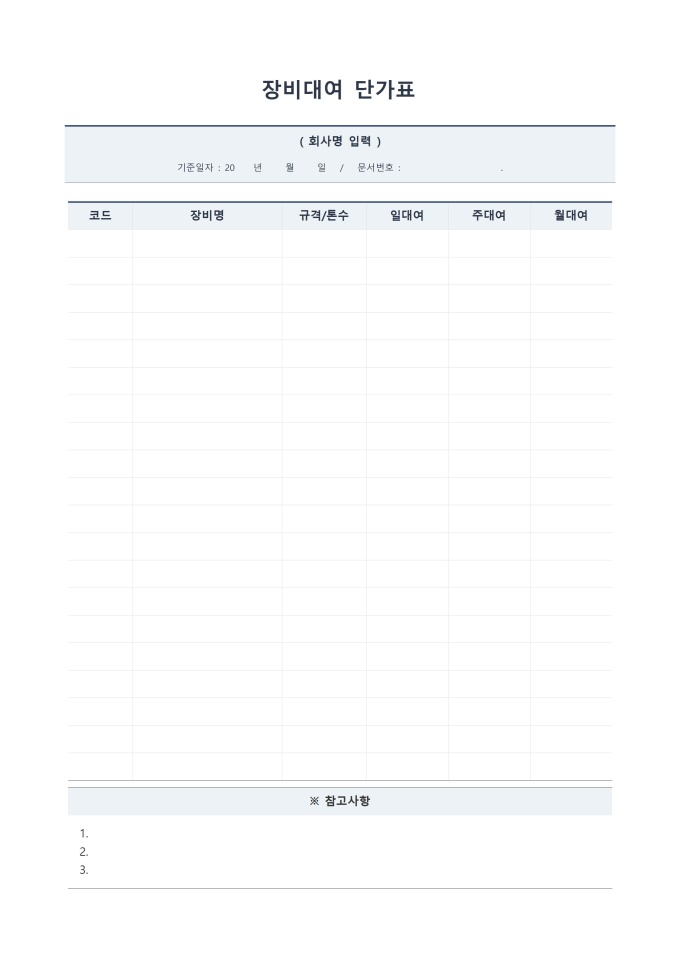 9,000원/월장비대여 단가표 서식입니다. 장비대여 단가표는 장비 운용의 투명성과 효율적인 비용 산정을 위해 필수적인 문서입니다. 이 서식은 각 장비의 고유 코드와 장비명, 그리고 세부적인 규격/톤수를 명확히 기재하여 체계적인 관리를 돕습니다.