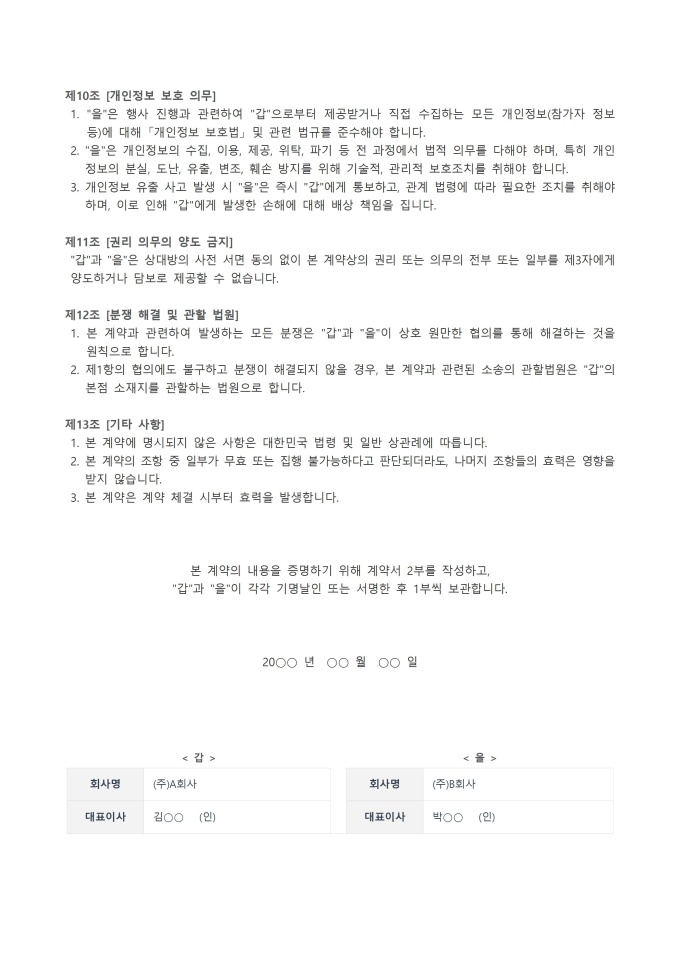 9,000원/월행사 진행 계약서 서식입니다. 행사 진행 계약서는 행사를 의뢰하는 측과 행사를 대행하는 업체 간의 약속을 명확히 하는 중요한 문서로 이 서식에는 행사 목적에 맞는 구체적인 프로그램 내용과 대행 업무 범위, 그리고 필요한 안전 조치 사항들이 상세하게 명시되어야 합니다. 특히, 행사 비용과 지급 방식, 계약 해지에 관한 조항, 그리고 손해배상과 같은 핵심 내용을 정확하게 기재하여 차후 발생할 수 있는 분쟁을 효과적으로 예방하는 데 도움을 줍니다.