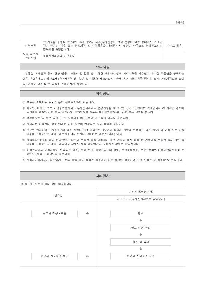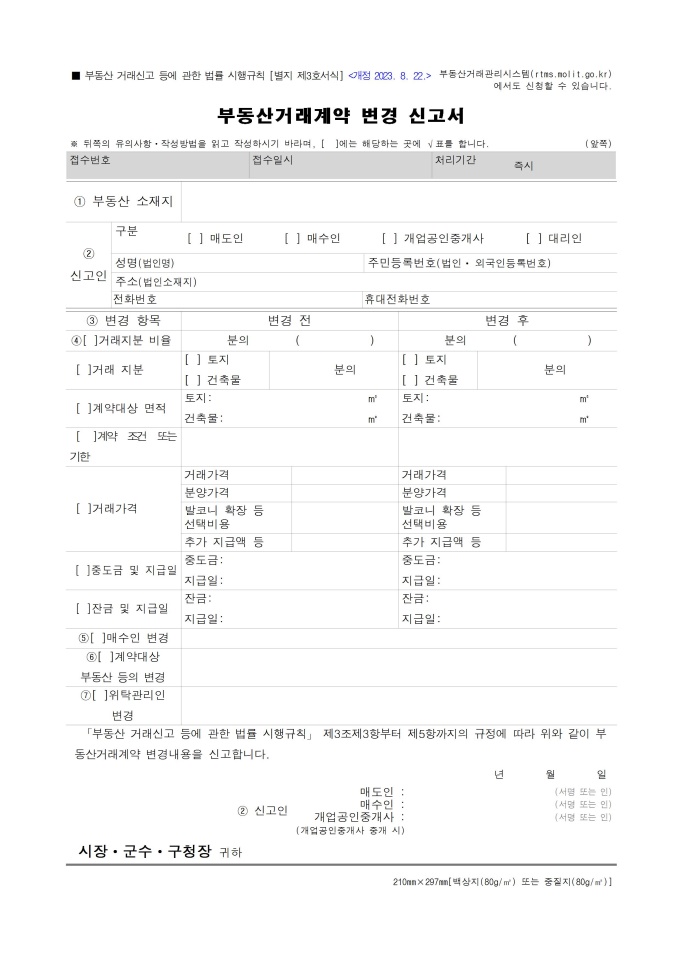 9,000원/월부동산거래계약 변경 신고서(부동산 거래신고 등에 관한 법률 시행규칙)[별지 제3호서식] 서식입니다. 「부동산 거래신고 등에 관한 법률 시행규칙」 제3조제3항부터 제5항까지의 규정에 따라 부동산거래계약 변경내용을 신고할 때 사용할 수 있는 서식입니다. [2023. 8. 22 개정]