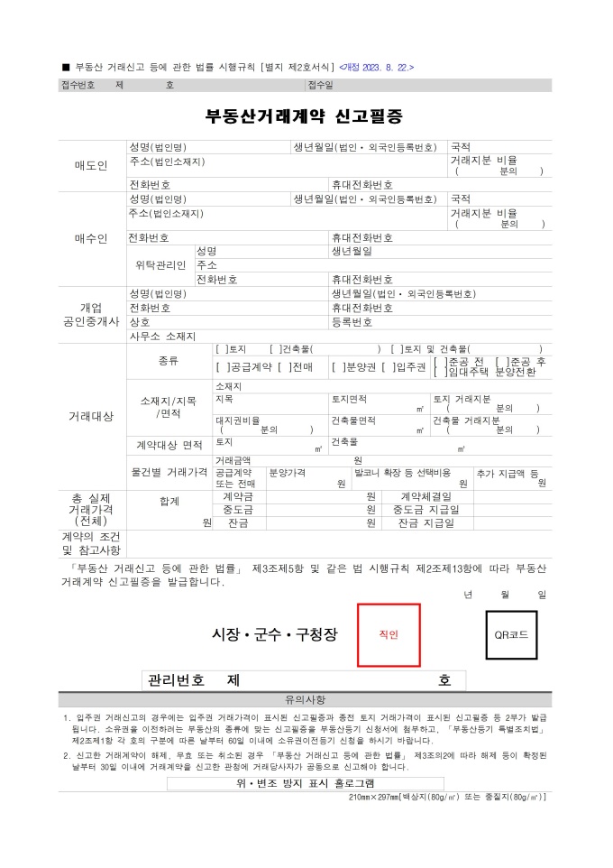 9,000원/월부동산거래계약 신고필증(부동산 거래신고 등에 관한 법률 시행규칙)[별지 제2호서식] 서식입니다. 「부동산 거래신고 등에 관한 법률」 제3조제5항 및 같은 법 시행규칙 제2조제13항에 따라 부동산거래계약 신고필증을 발급할 때 사용할 수 있는 서식입니다. [2023. 8. 22 개정]
