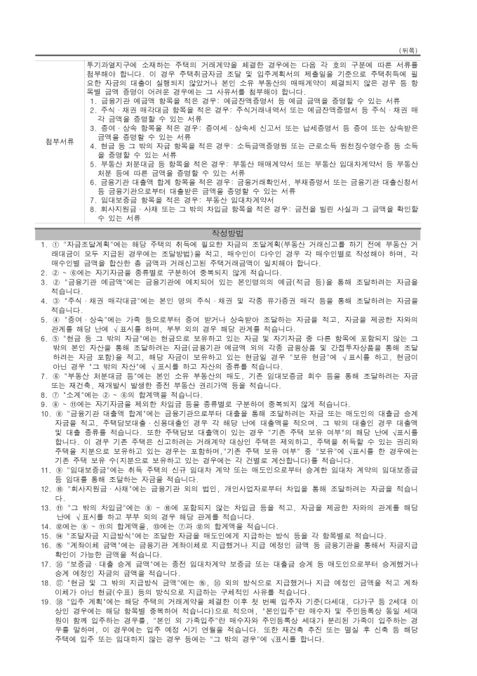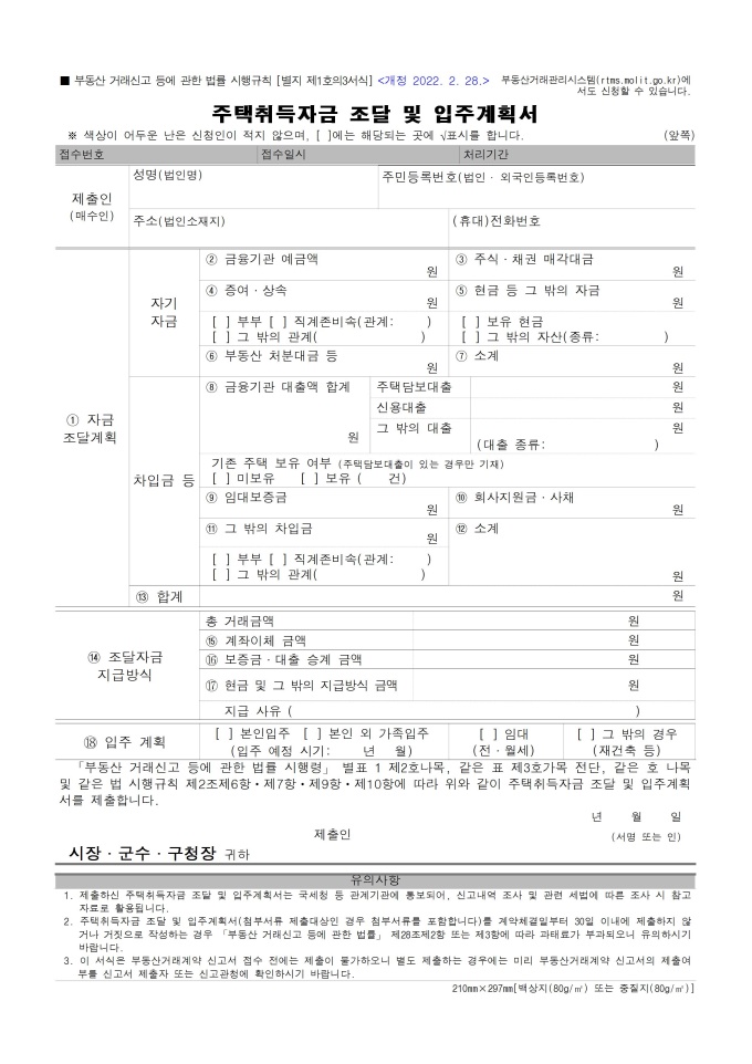 9,000원/월주택취득자금 조달 및 입주계획서(부동산 거래신고 등에 관한 법률 시행규칙) [별지 제1호의3서식] 서식입니다. 「부동산 거래신고 등에 관한 법률 시행령」 별표 1 제2호 나목, 같은 표 제3호 가목 전단, 같은 호 나목 및 같은 법 시행규칙 제2조 제6항, 제7항, 제9항, 제10항에 따라 주택취득자금 조달 및 입주계획서를 제출할 때 사용할 수 있는 서식입니다. [2022. 2. 28 개정]