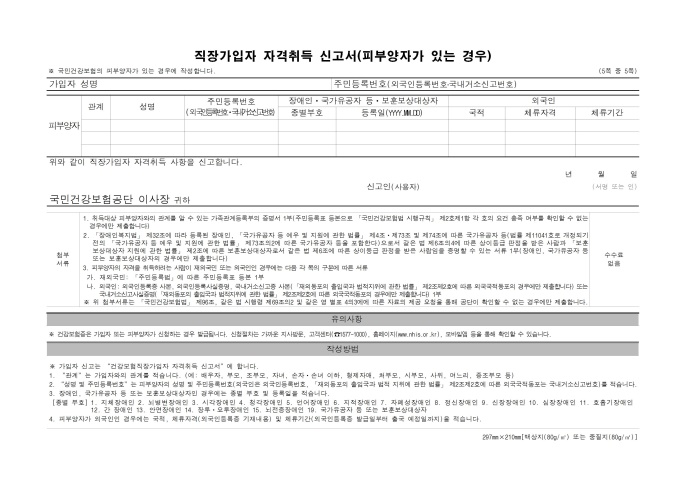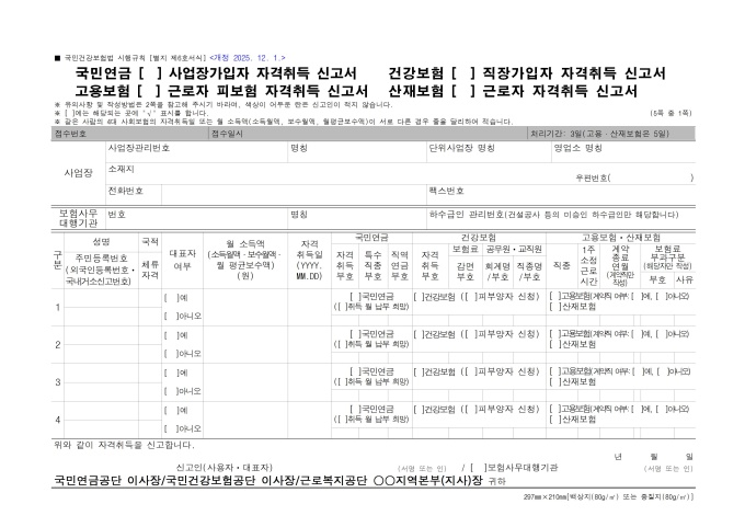 9,000원/월국민연금 사업장가입자 자격취득 신고서, 건강보험 직장가입자 자격취득 신고서, 고용보험 근로자 피보험 자격취득 신고서, 산재보험 근로자 자격취득 신고서(국민건강보험법 시행규칙)[별지 제6호서식] 서식입니다. [2025. 12. 1 개정]