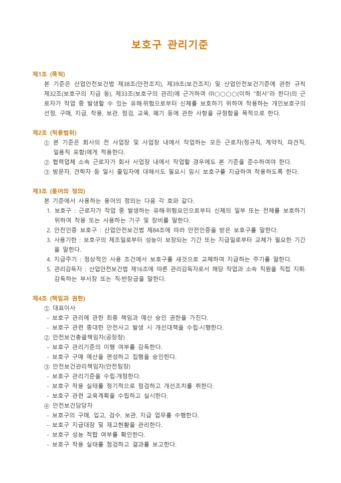 9,000원/월보호구 관리기준 서식입니다. 보호구 관리기준은 산업안전보건법 제38조(안전조치), 제39조(보건조치)와 산업안전보건기준에 관한 규칙 제32조(보호구의 지급 등), 제33조(보호구의 관리)에 근거하여 사업장에서 근로자의 안전과 건강을 보호하기 위해 개인보호구(PPE)의 선정, 구매, 지급, 착용, 점검, 교육, 폐기에 관한 전반적인 관리체계를 규정한 사내 규정입니다.