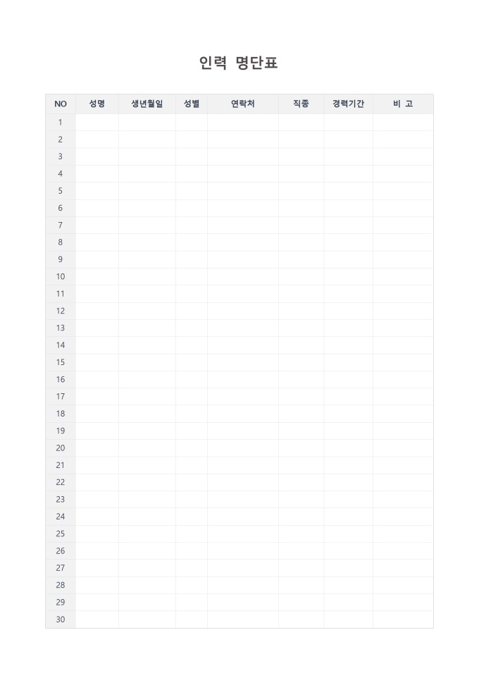 9,000원/월인력 명단표 서식입니다. 인력 명단표는 특정 조직, 부서, 또는 프로젝트에 소속된 인력의 주요 정보를 체계적으로 정리해 놓은 문서입니다. 이는 인적 자원의 현황을 한눈에 파악하고, 비상 시 연락 체계를 구축하는 등 다양한 관리 목적으로 활용됩니다.