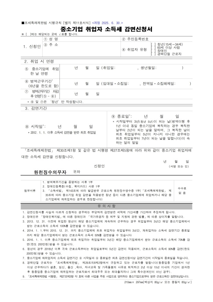 9,000원/월중소기업 취업자 소득세 감면신청서 서식입니다. 「조세특례제한법」 제30조제1항 및 같은 법 시행령 제27조제5항에 따라 중소기업 취업자에 대한 소득세 감면을 신청할 때 사용할 수 있는 서식입니다. 조세특례제한법 시행규칙 [별지 제11호서식] <개정 2025. 6. 30.>