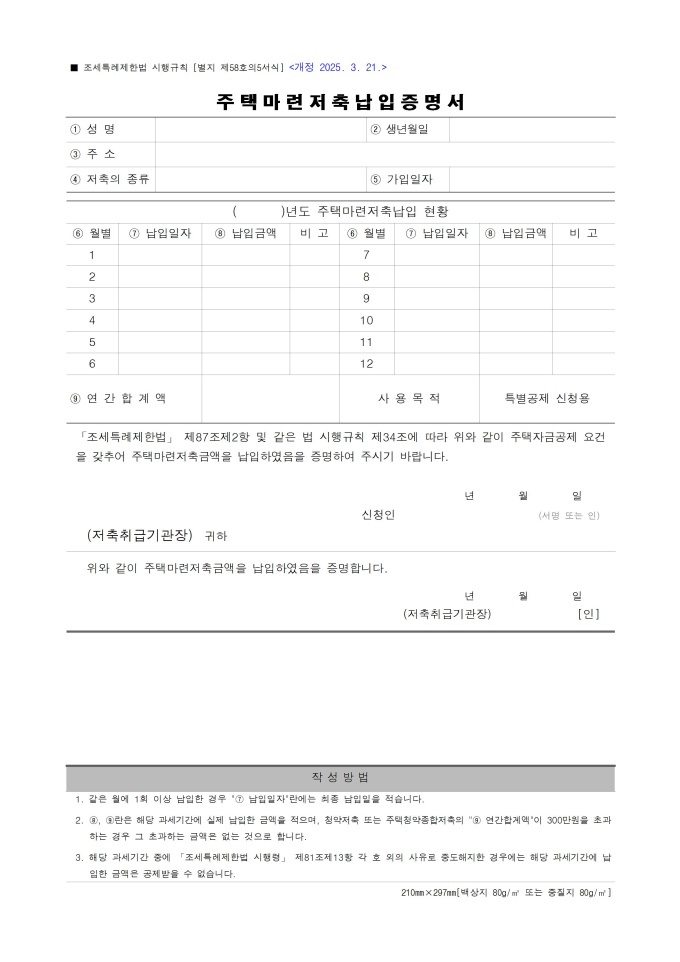 9,000원/월주택마련저축납입증명서 서식입니다. 「조세특례제한법」 제87조제2항 및 같은 법 시행규칙 제34조에 따라 주택자금공제 요건을 갖추어 주택마련저축금액을 납입하였음을 증명하고자 할 때 사용할 수 있는 서식입니다. 조세특례제한법 시행규칙 [별지 제58호의5서식] <개정 2025. 3. 21.>