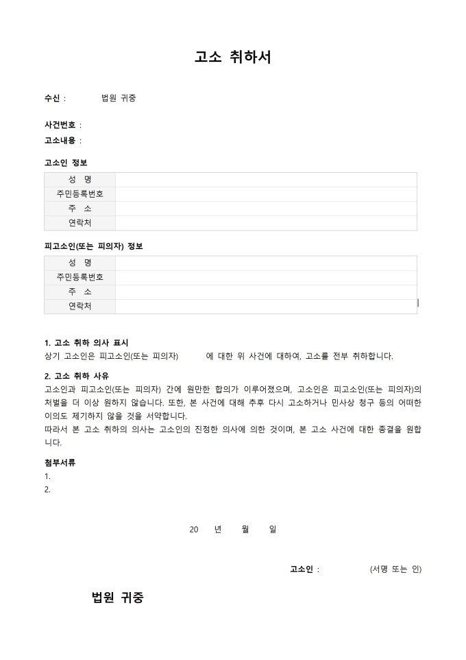 9,000원/월고소 취하서 서식입니다. 고소 취하서는 고소인이 범죄 행위가 있었다고 주장하며 수사기관(경찰, 검찰)이나 법원에 제기했던 형사 고소를 합의나 기타 다른 이유로 인해 철회하고 더 이상 피고소인의 처벌을 원치 않는다는 의사를 전달하는 문서입니다.