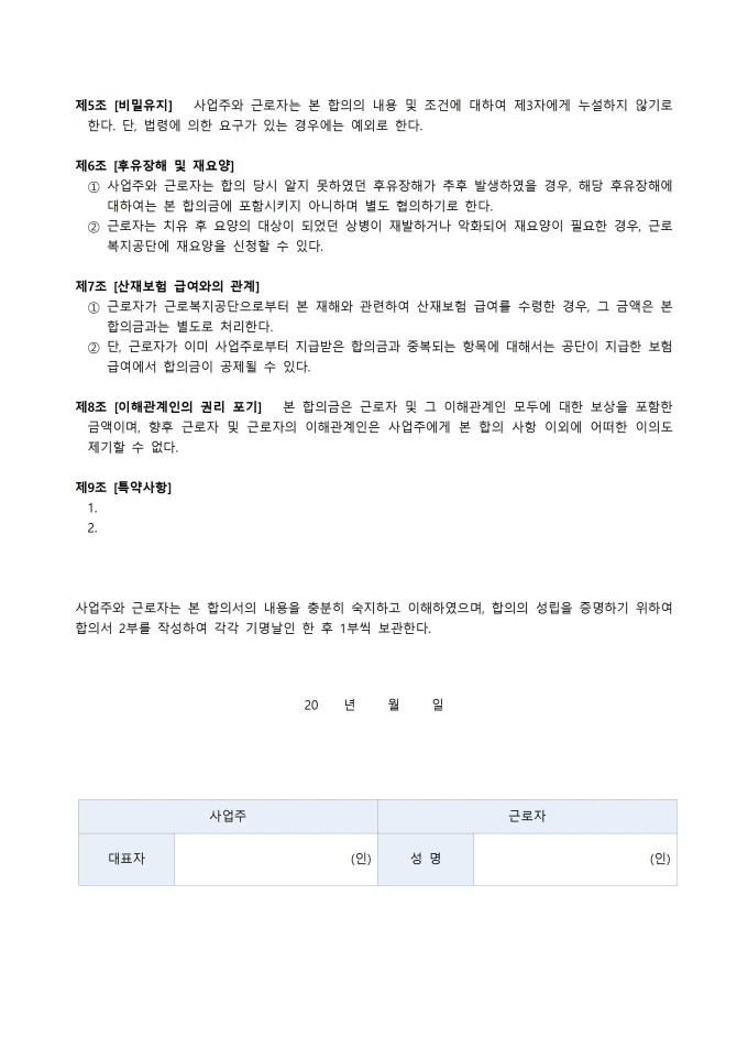 9,000원/월산재합의서 서식입니다. 산재 합의서는 산업재해로 인한 피해 보상과 관련한 민·형사 및 행정상 분쟁을 원만하게 해결하기 위해 피해 근로자와 사업주 간에 체결하는 합의 문서입니다. 근로자가 산업재해로 인해 입은 손해에 대해 사업주가 일정 금액을 지급하며, 이를 토대로 근로자가 추가적인 법적 청구를 하지 않기로 약정하는 것이 핵심 내용입니다.