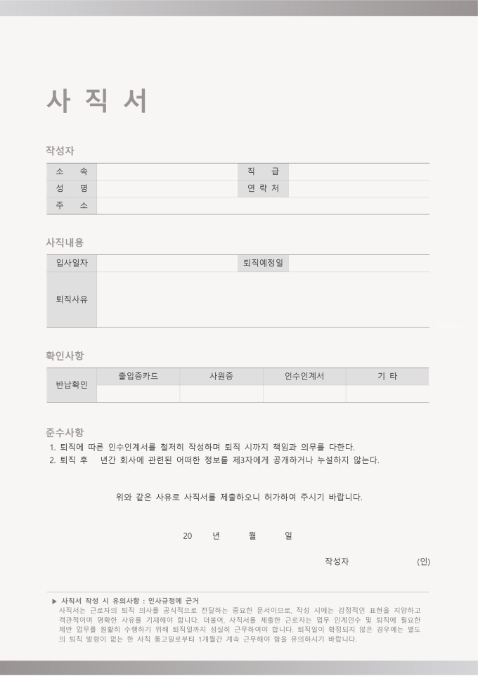 9,000원/월사직서 (2026년 올해의컬러 클라우드댄서) 서식입니다. 사직서는 본인이 현재 맡고 있는 직무에서 자진하여 퇴직 의사를 공식적으로 밝히는 문서입니다. 해당 서식에는 2026년 올해의 컬러인 '클라우드댄서'를 활용한 디자인이 적용되어 있습니다. 사직서 작성 시에는 사직 의사, 퇴직 예정일 등을 명확하게 기술하는 것이 중요합니다.
