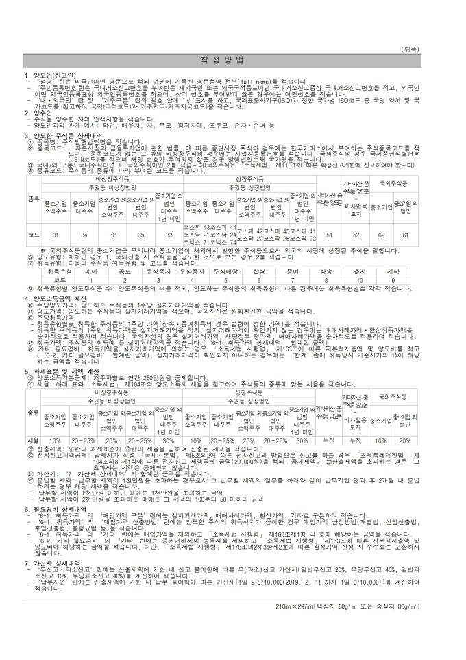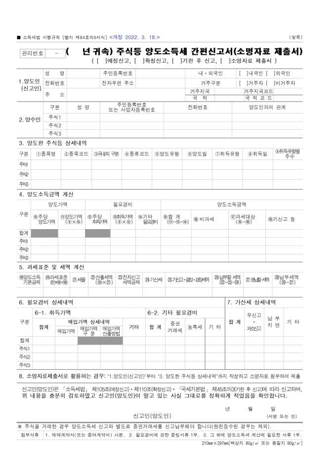 9,000원/월주식등 양도소득세 간편신고서(소명자료 제출서)(예정신고, 확정신고, 기한 후 신고, 소명자료 제출서) 서식입니다. 소득세법」 제105조(예정신고)ㆍ제110조(확정신고)ㆍ「국세기본법」 제45조의3(기한 후 신고)에 따라 신고하고자 할 때 사용할 수 있는 서식입니다. 소득세법 시행규칙 [별지 제84호의5서식] <개정 2022. 3. 18.>
