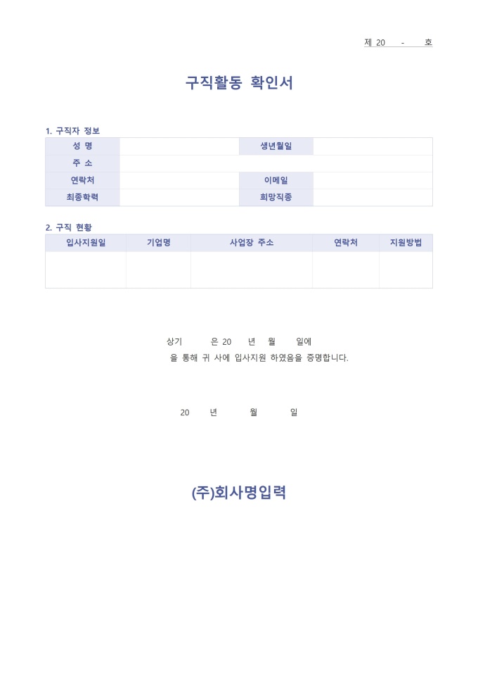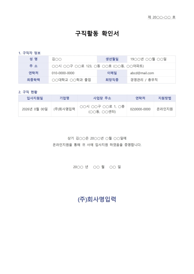 9,000원/월구직활동 확인서 서식입니다. 구직활동 확인서는 구직자가 취업을 위해 노력하고 있음을 증명하기 위해 작성하는 문서입니다. 주로 실업급여 신청이나 구직 지원 프로그램 참여 시 제출하는 경우가 많으며, 구직활동을 한 회사명, 주소, 연락처, 지원방법 등을 명확히 기재합니다. 이를 통해 구직자의 적극적인 취업 의지를 객관적으로 입증할 수 있도록 돕습니다.