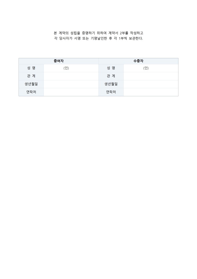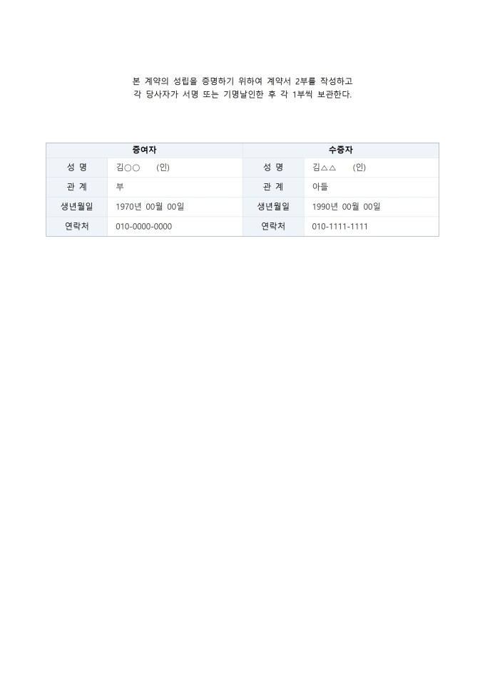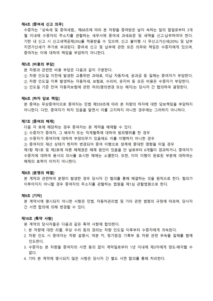본 계약서는 차량 증여 사실을 법적으로 명확히 하여 향후 발생할 수 있는 소유권 분쟁을 예방하고, 차량 등록 및 명의 이전 시 필요한 증빙 자료로 활용됩니다. 또한 차량 상태에 대한 특별 약정이나 기타 조건이 있다면 계약서에 함께 명시하여 양 당사자의 권리와 의무를 분명히 하는 것이 좋습니다.