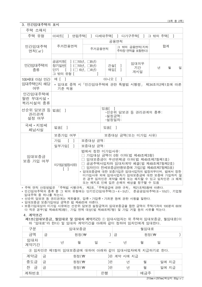 9,000원/월표준임대차계약서 입니다. 해당 서식은 임대사업자와 임차인이 임대차계약을 체결하고 이를 증명하기 위해 계약서 2통을 작성하고 각각 날인한 후 1통씩 보관해야 합니다. 민간임대주택에 관한 특별법 시행규칙 [별지 제24호서식] <개정 2025. 10. 31>