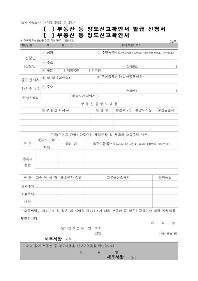 9,000원/월부동산 등 양도신고확인서 발급 신청서, 부동산 등 양도신고확인서 서식입니다. 「소득세법」 제108조 및 같은 법 시행령 제171조에 따라 부동산 등 양도신고확인서 발급 신청서를 제출할 때 사용할 수 있는 서식입니다. 소득세법 시행규칙 [별지 제88호서식] <개정 2026. 3. 20.>
